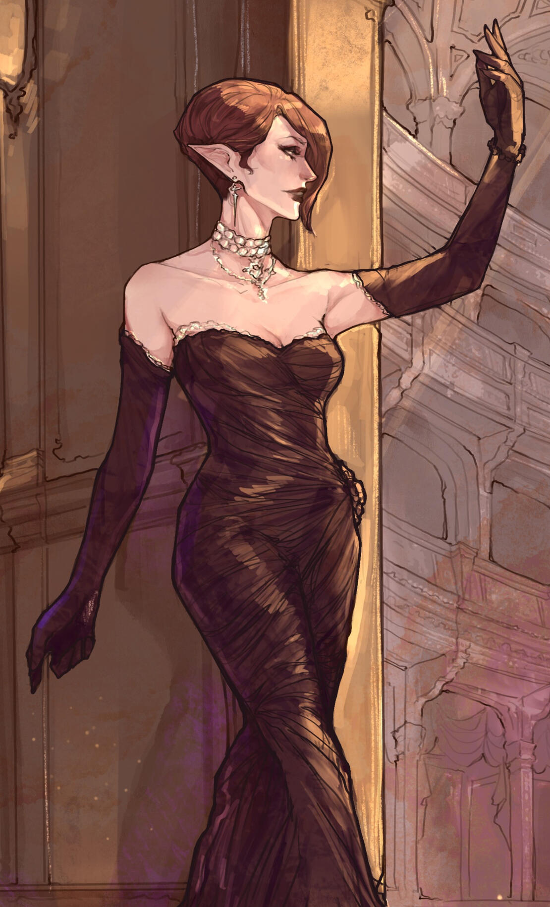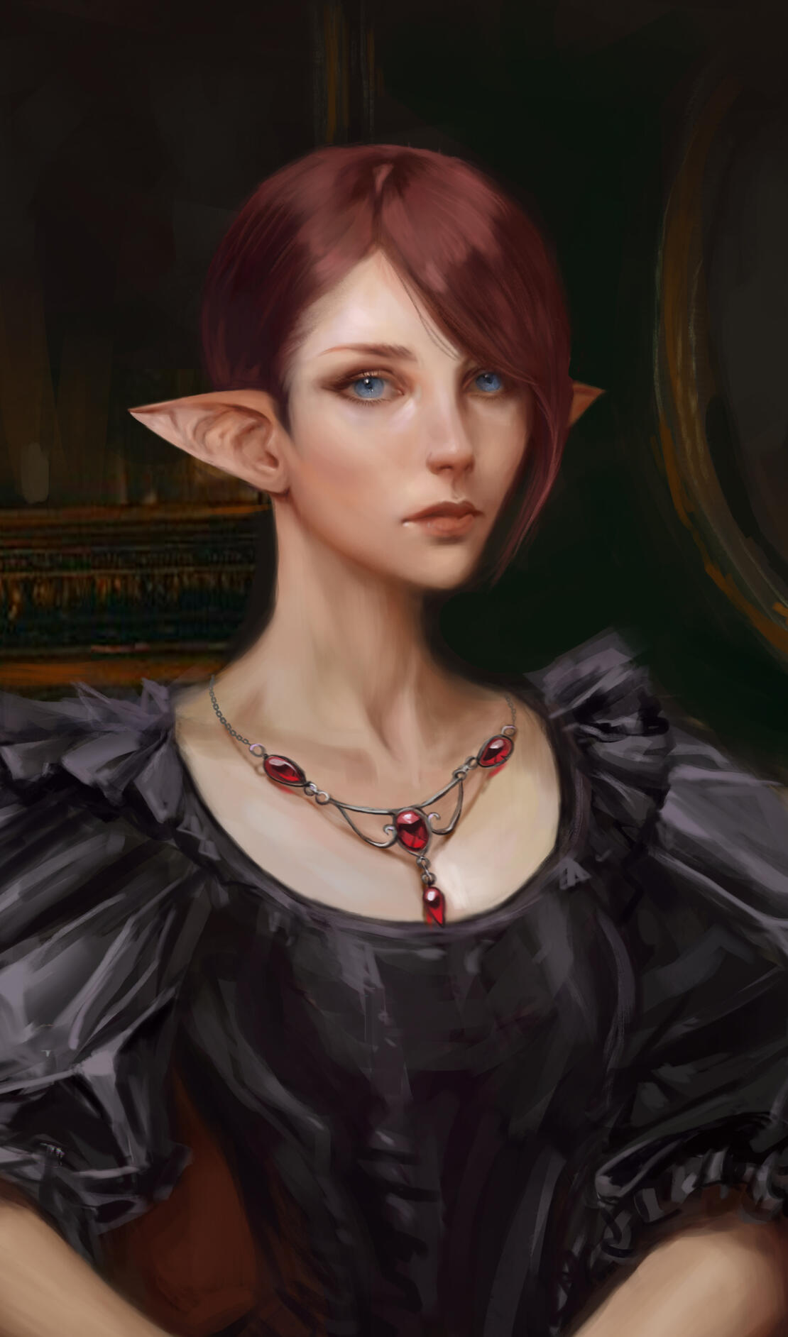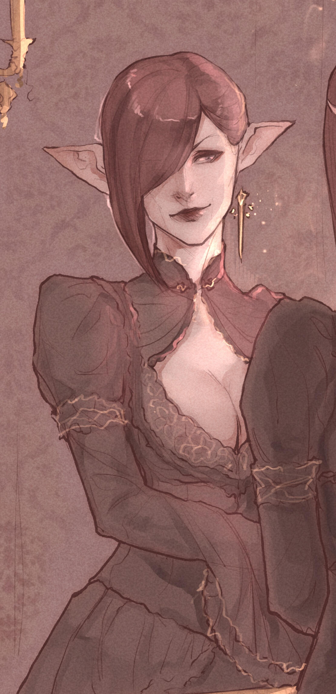 A woman of warm elegance, Evilie was raised in a station and city overly concerned with appearances and presentations. For the majority of her younger turns she lived within the confines of expectation for a lady of Ishgard, playing the role her noble blood had set out for her. Filtered among the decorum and etiquette others might describe her as intelligent, caring, and possessing an innate, insatiable curiosity and willingness to learn.Evilie's physical appearance can be described as elegant and precise. She takes great care in her presentation, mannerisms practiced and recited from turns of attending formal functions and entertaining house guests of her father's. Though a smile comes easily to her, there's a latent pensiveness hidden just below the surface; weight not oft expected of someone her younger age. One might see the woman was made to grow up too quickly, a childhood spent preparing for adulthood, and then living it before her time.On the upper end of height for Elezen women, Evilie never slouches, always standing tall and with an air of confidence. Makeup and jewelry is typically applied with thought and deliberateness to her choices. Typically this means accents to her eyes and darker lipsticks in red shades paired with garnets and rubies. Deep reds seem to be a staple in her wardrobe.
